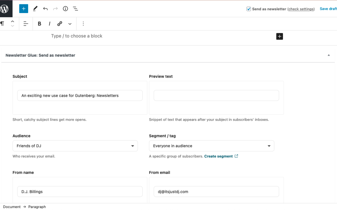 Publication Glue takes benefit of the customized submit kind, including a brand new house within the editor proper beneath the submit. Simply write and layout your submit as you usually would. Earlier than you put up, you’ll make a choice your target audience and section, regulate your topic line and preview textual content, or even ship your self a take a look at e mail.