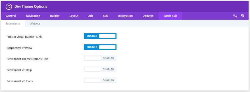 Clicking Settings takes you to the Divi Theme Possibility. A brand new tab is added to the Divi Theme Choices referred to as Combat Go well with. Right here, you’ll allow options and widgets.