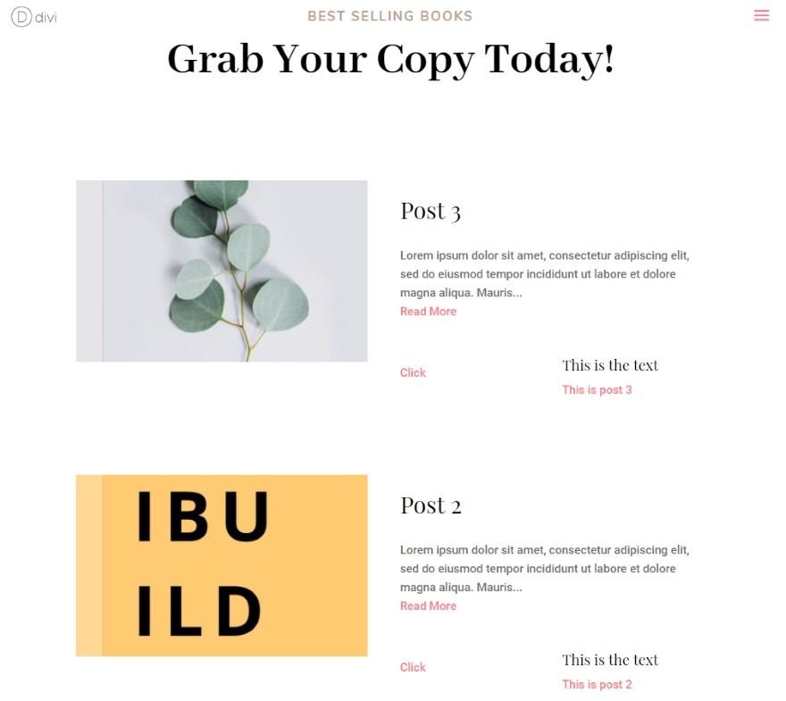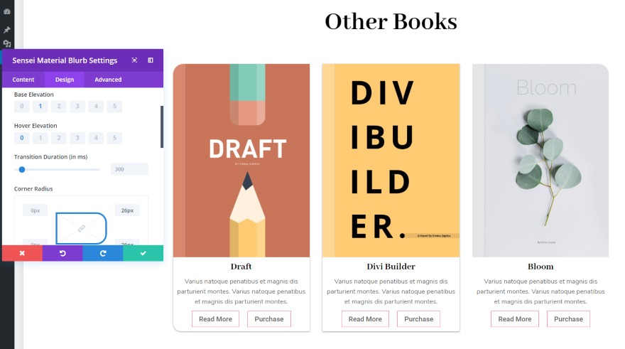 The Subject material Blurb provides one new module. On this instance, I’m recreating the ebook knowledge from the Creator structure with Subject material Blurbs. They had been at the beginning made with 3 person modules: textual content, symbol, and button modules for each and every ebook. I’m in a position to switch them with a unmarried module. I’m making a couple of customizations as I’m going. I’ve added a 2nd button, adjusted the border, and custom designed the shadow for each common and hover. You’ll be able to use pictures or icons and you’ll have it to switch to a brand new symbol or icon on hover.