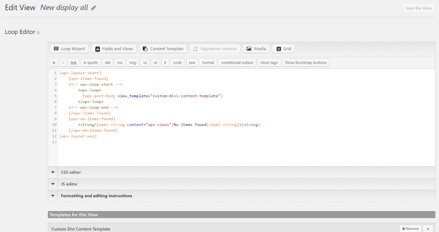Skip the loop wizard and make a selection a content material template. Right here you’ll select Divi, which is able to upload Divi to the template choices. be certain that the Divi template is inside the wpv-loop tags.