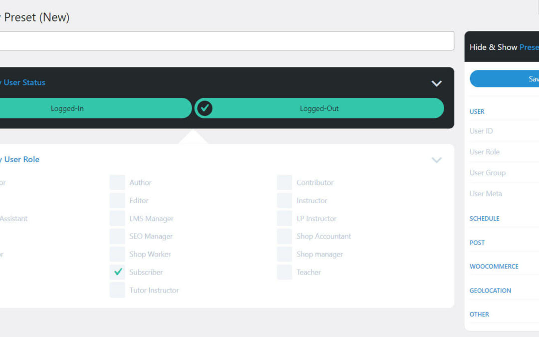 We’ll take a more in-depth have a look at this panel and its settings within the subsequent phase. Via default, the brand new preset comprises the consumer standing choice with logged-in and logged-out preselected. You’ll be able to disable one by way of clicking on its checkmark. You’ll be able to additionally disable each by way of clicking at the toggle in the precise sidebar. It is a not unusual standing, so it is smart to incorporate it by way of default.