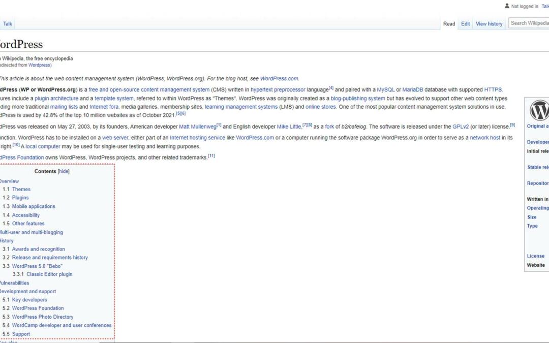 A just right instance of anchor hyperlinks in use may also be discovered when making a desk of contents. A very easy position to discover a desk of contents on the net is Wikipedia. That is WordPress’ Wikipedia web page. Throughout the web page, we discover the desk of contents. Throughout the desk of contents, there’s a record of hyperlinks that direct you to other headings and spaces of the web page. Those are anchor hyperlinks.