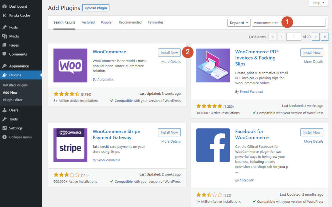 In case that is your first time putting in a WordPress plugin, let’s stroll throughout the procedure. One of the simplest ways to arrange WooCommerce is to get entry to your WordPress dashboard and move to Plugins > Upload New. Use the hunt bar to search for “WooCommerce” (1), and click on on Set up Now subsequent to the primary end result (2):