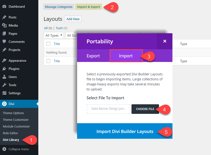 After you obtain the report, unzip it. You’re going to to find that it accommodates a report named “sales-banner-design.json”. That is what you’re going to load on your Divi library. Now move on your wordpress dashboard and navigate to Divi > Divi Library. Then click on the import button on the peak of the web page. From the portability popup window, choose the Import tab and make a selection the sales-banner-design.json report. Then click on the Import Divi Builder Layouts button.