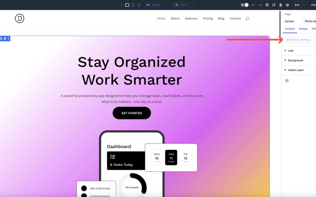 Merely sort a key phrase into the quest bar throughout the settings panel. This is applicable to modules, columns, rows, or sections. For instance, you’ll seek for content material settings in a blurb via coming into a key phrase.