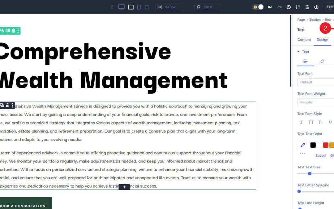 This web page makes use of Sections, Rows, Columns, Textual content, Blurb, Symbol, Button, and Menu Modules. By means of preserving issues so simple as they are able to be for this actual web page, I scale back the choice of Possibility Teams I want to design with.
