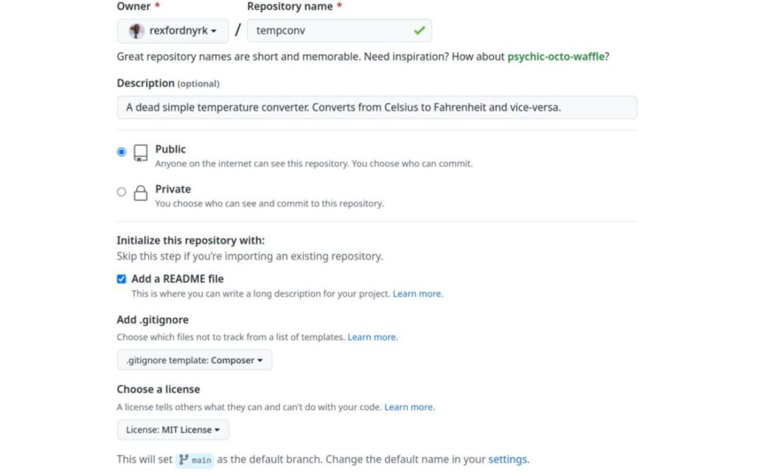 This instructional makes use of the undertaking title tempconv. Within the Description box, supply temporary information about the applying. Take a look at the field so as to add a README document, make a choice the Composer template for the Upload .gitignore choice, and make a choice a license of your selection—this instructional makes use of MIT License. After all, click on Create repository.